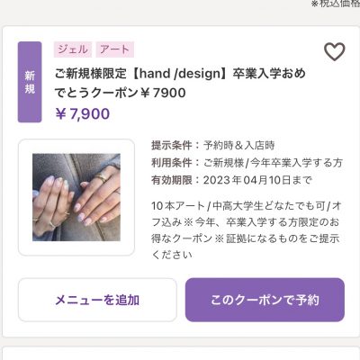 ご予約は、お電話かホットペッパービューティーのネット予約からお願いいたします。施術中お電話に出られませんのでご了承ください。ホットペッパーからもメニューの選択が可能になっておりますので、ご希望のメニューを選んでご都合の良い日時でご予約ください。ご来店心よりお待ちしております。